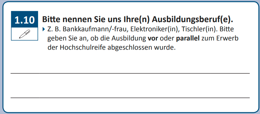 Z. B. Bankkaufmann/-frau, Elektroniker(in), Tischler(in). Bitte geben Sie an, ob die Ausbildung vor oder parallel zum Erwerb der Hochschulreife abgeschlossen wurde.