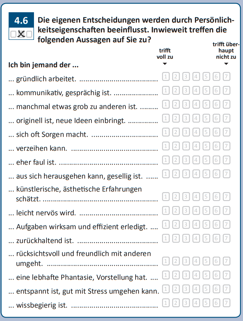 vgl. Schupp, J., & Gerlitz, J.-Y. (2014). Big Five Inventory-SOEP (BFI-S). Zusammenstellung sozialwissenschaftlicher Items und Skalen (ZIS). https://doi.org/10.6102/zis54 (modifiziert)