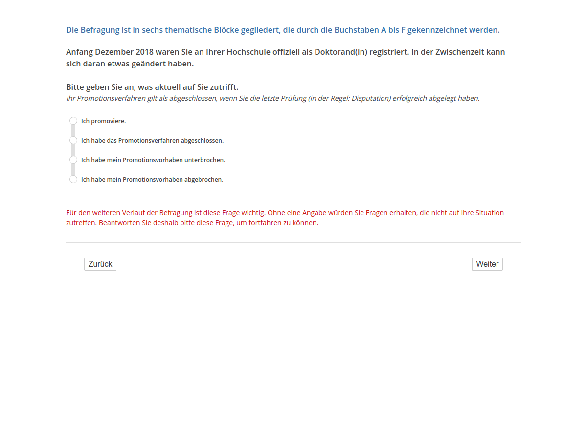 Liebe Teilnehmerin, lieber Teilnehmer, bitte beachten Sie, dass Sie die Nacaps-Befragung nur fortführen können, wenn Sie eine Angabe zu der Frage gemacht haben, welchen Status Ihre Promotion hat. Sofern Sie Interesse an der Teilnahme an der Studie haben, klicken Sie bitte unten auf den Button „Zurück“ und beantworten Sie nachfolgend die Frage zum Status Ihrer Promotion. Ansonsten können Sie uns unten Kommentare und Anregungen zur Studie zukommen lassen.