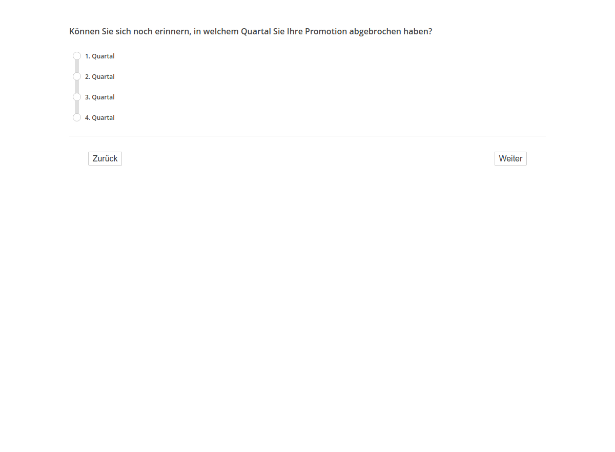 Können Sie sich noch erinnern, in welchem Quartal Sie Ihre Promotion abgebrochen haben?