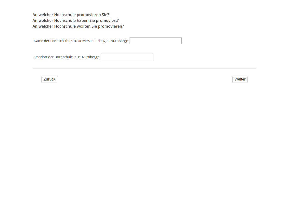 An welcher Hochschule promovieren Sie?/An welcher Hochschule haben Sie promoviert?/An welcher Hochschule wollten Sie promovieren?