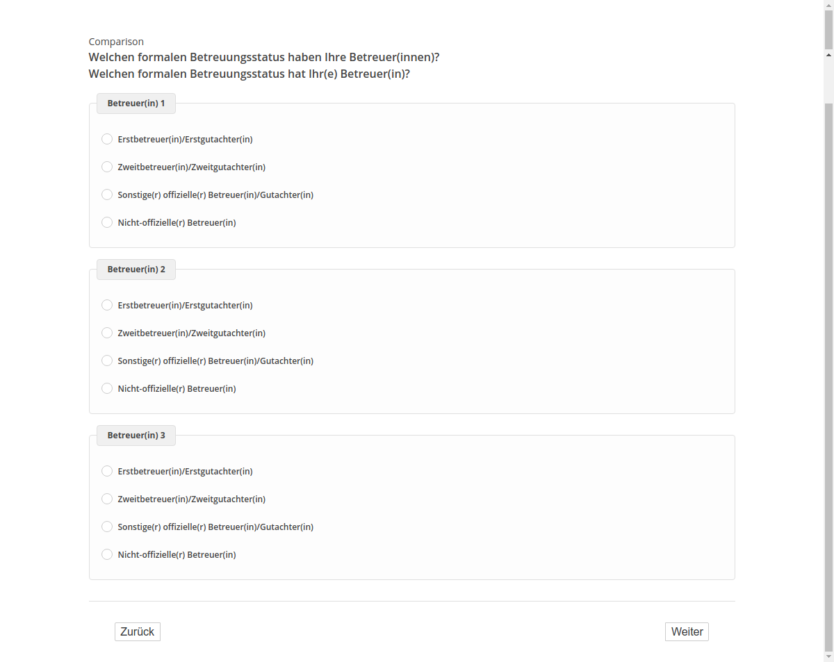 Welchen formalen Betreuungsstatus haben Ihre Betreuer(innen)?/Welchen formalen Betreuungsstatus hat Ihr(e) Betreuer(in)?