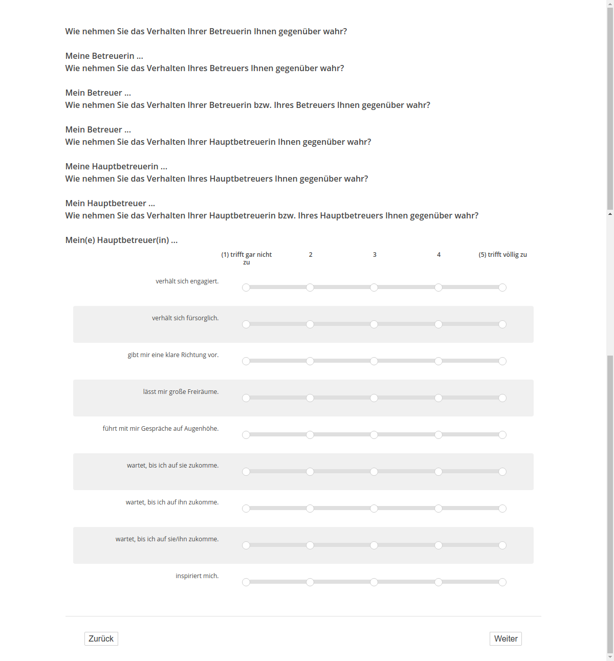 Wie nehmen Sie das Verhalten Ihrer Betreuerin Ihnen gegenüber wahr? Meine Betreuerin ...,Wie nehmen Sie das Verhalten Ihres Betreuers Ihnen gegenüber wahr? Mein Betreuer ...,Wie nehmen Sie das Verhalten Ihrer Betreuerin bzw. Ihres Betreuers Ihnen gegenüber wahr? Mein Betreuer ...,Wie nehmen Sie das Verhalten Ihrer Hauptbetreuerin Ihnen gegenüber wahr? Meine Hauptbetreuerin ...,Wie nehmen Sie das Verhalten Ihres Hauptbetreuers Ihnen gegenüber wahr? Mein Hauptbetreuer ...,Wie nehmen Sie das Verhalten Ihrer Hauptbetreuerin bzw. Ihres Hauptbetreuers Ihnen gegenüber wahr? Mein(e) Hauptbetreuer(in) ...