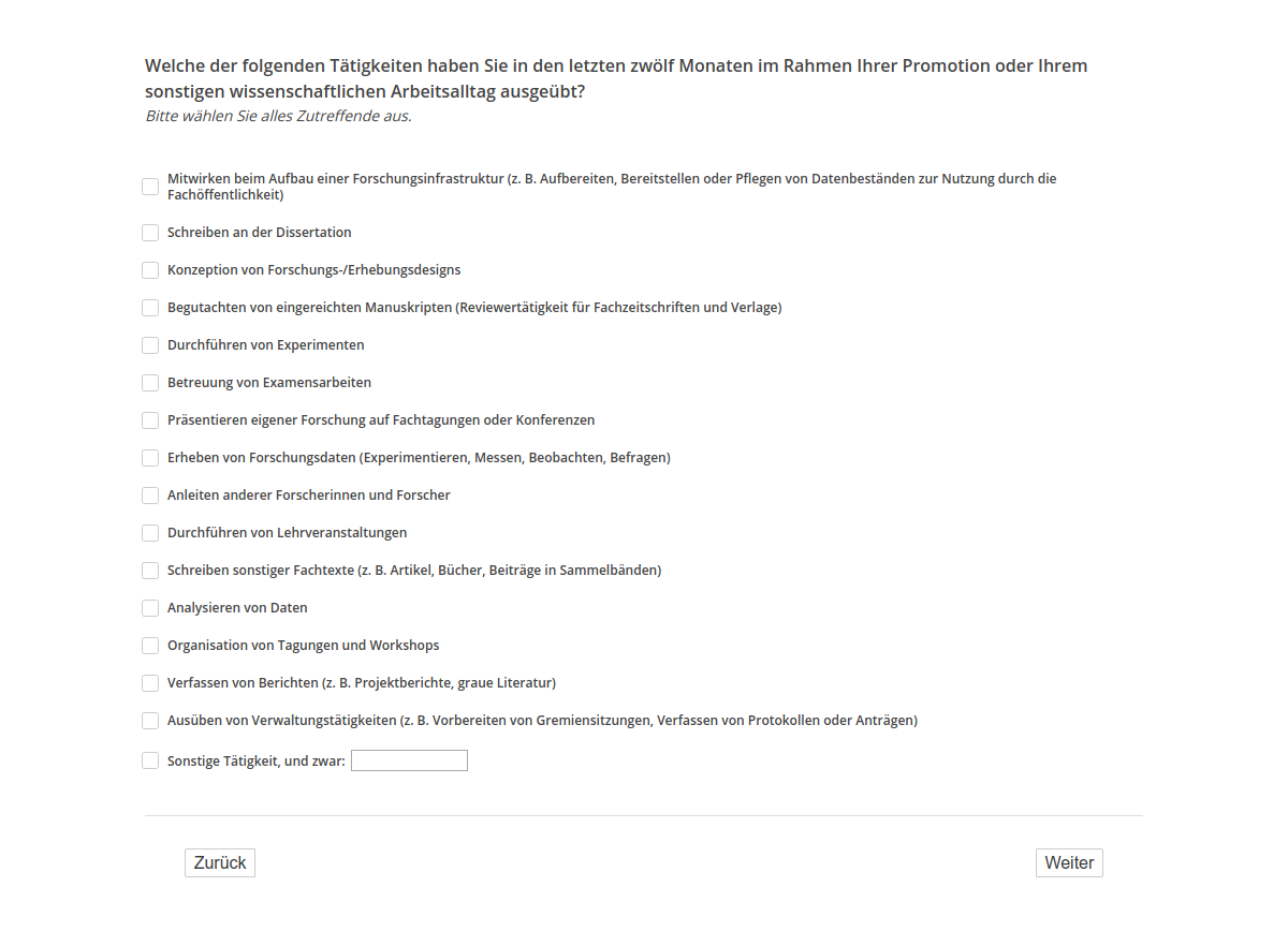 Welche der folgenden Tätigkeiten haben Sie in den letzten zwölf Monaten im Rahmen Ihrer Promotion oder Ihrem sonstigen wissenschaftlichen Arbeitsalltag ausgeübt?