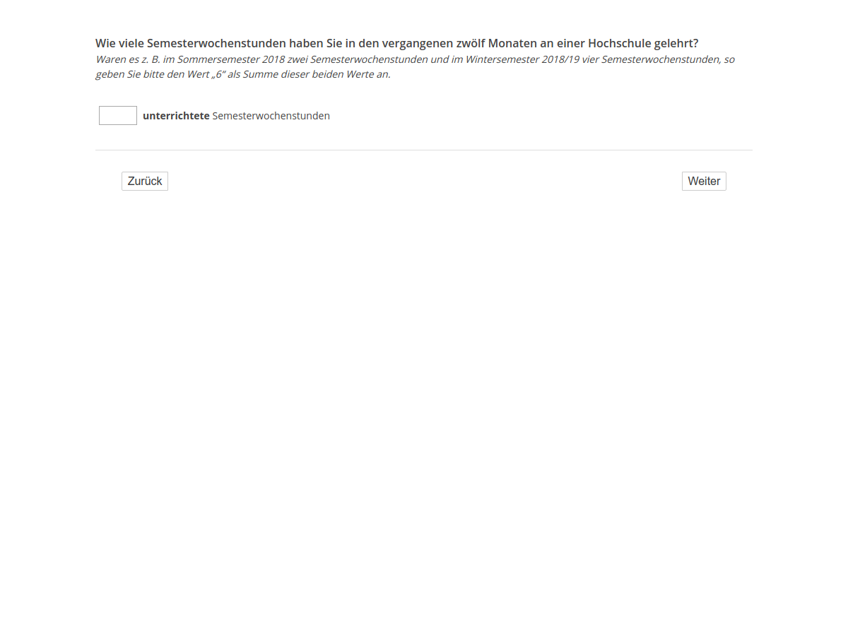Waren es z. B. im Sommersemester 2018 zwei Semesterwochenstunden und im Wintersemester 2018/19 vier Semesterwochenstunden, so geben Sie bitte den Wert „6“ als Summe dieser beiden Werte an.