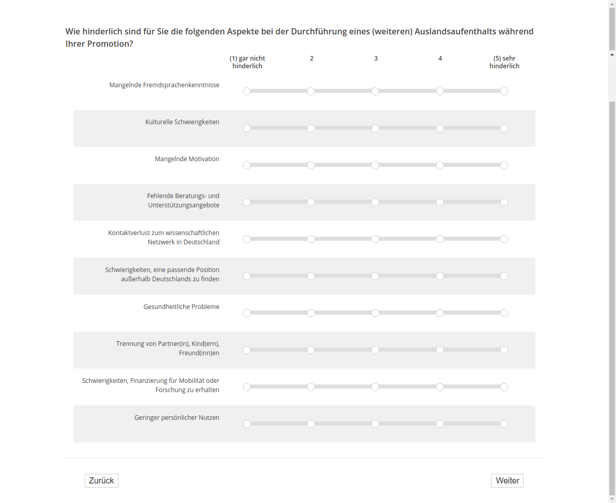 Wie hinderlich sind für Sie die folgenden Aspekte bei der Durchführung eines (weiteren) Auslandsaufenthalts während Ihrer Promotion?