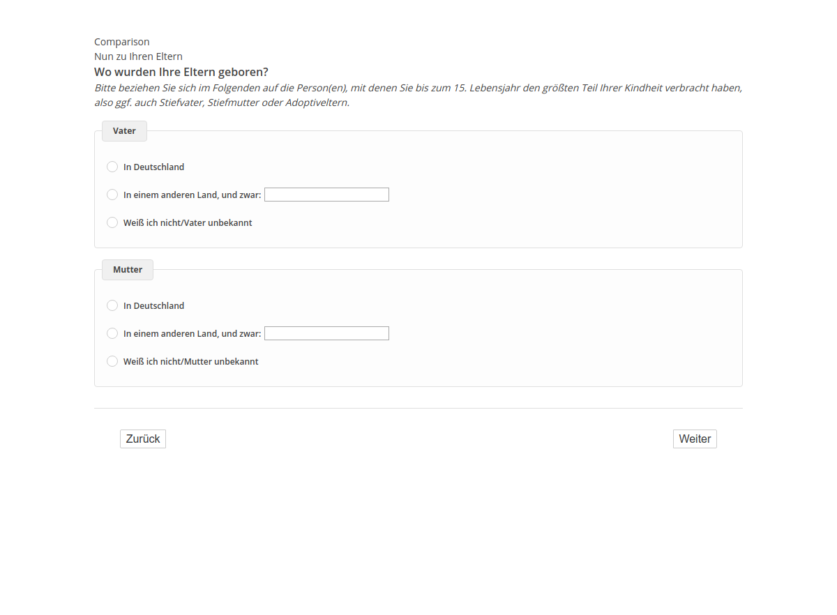 Sind Ihre Eltern nach Deutschland zugewandert?/Ist Ihr Vater nach Deutschland zugewandert?/Ist Ihre Mutter nach Deutschland zugewandert?