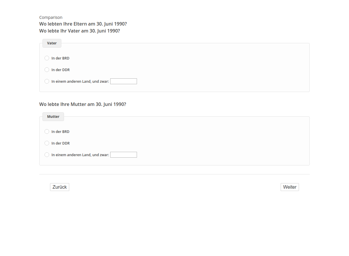 Wo lebten Ihre Eltern am 30. Juni 1990?/Wo lebte Ihr Vater am 30. Juni 1990?/Wo lebte Ihre Mutter am 30. Juni 1990?