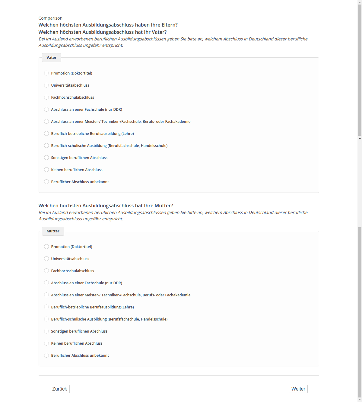 Welchen höchsten Ausbildungsabschluss haben Ihre Eltern?/Welchen höchsten Ausbildungsabschluss hat Ihr Vater?/Welchen höchsten Ausbildungsabschluss hat Ihre Mutter?