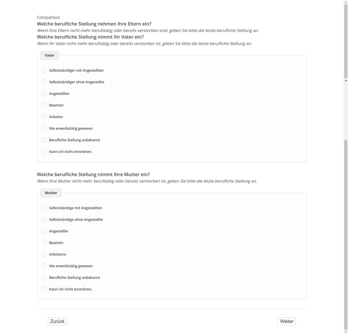 Welche berufliche Stellung nehmen Ihre Eltern ein?/Welche berufliche Stellung nimmt Ihr Vater ein?/Welche berufliche Stellung nimmt Ihre Mutter ein?