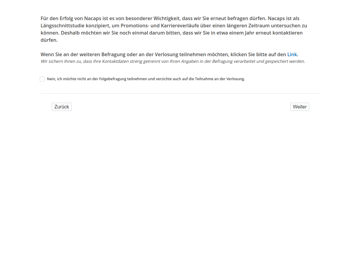 In etwa einem Jahr möchten wir Sie gerne zu einer weiteren Nacaps-Befragung einladen. Wenn Sie an dieser weiteren Befragung oder an der Verlosung teilnehmen möchten, klicken Sie bitte auf den Link. In beiden Fällen benötigen wir Ihre Kontaktdaten.