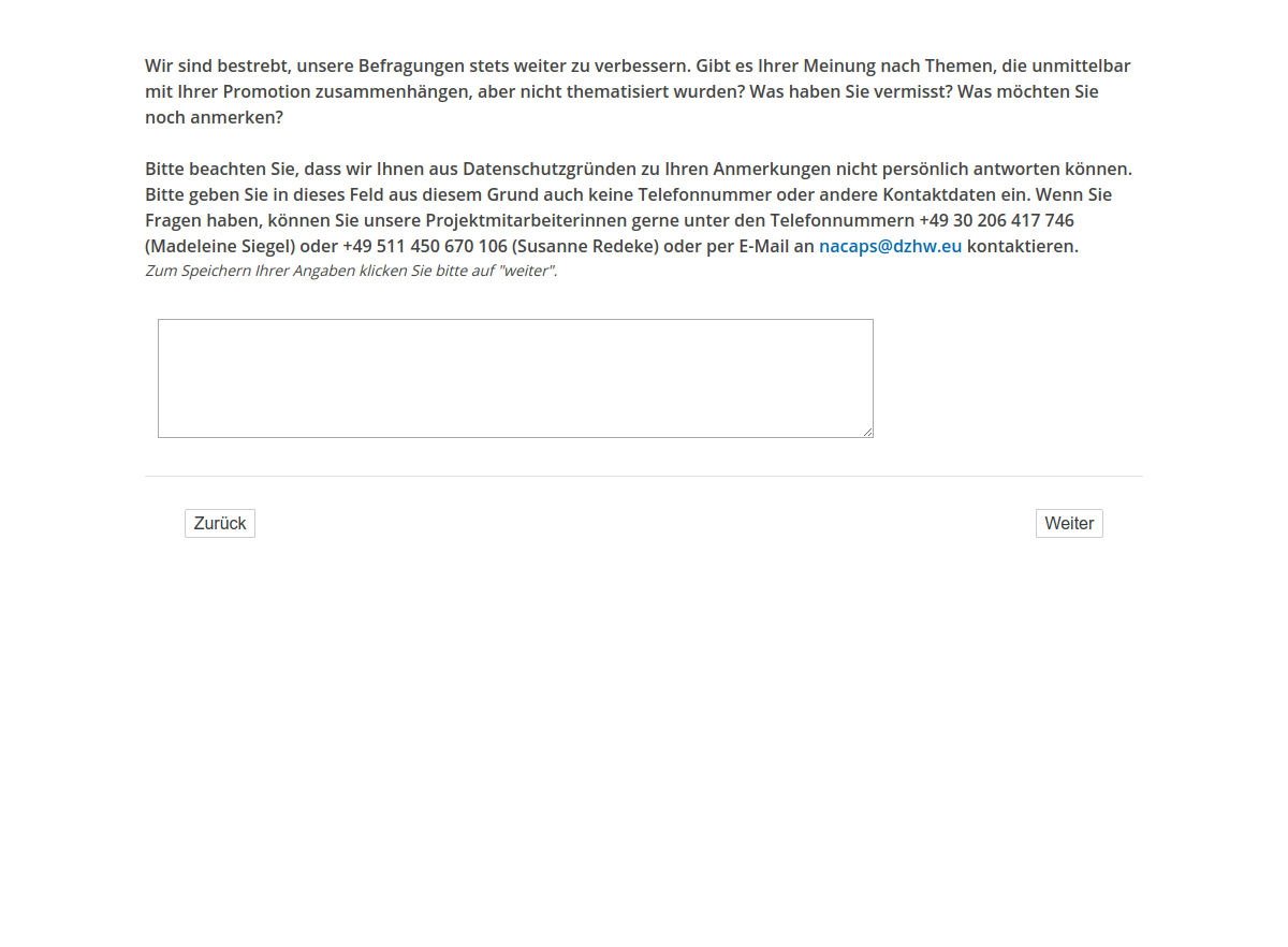 Wir sind bestrebt, unsere Befragungen stets weiter zu verbessern. Gibt es Ihrer Meinung nach Themen, die unmittelbar mit Ihrer Promotion zusammenhängen, aber nicht thematisiert wurden? Was haben Sie vermisst? Was möchten Sie noch anmerken? Bitte beachten Sie, dass wir Ihnen aus Datenschutzgründen zu Ihren Anmerkungen nicht persönlich antworten können. Bitte geben Sie in dieses Feld aus diesem Grund auch keine Telefonnummer oder andere Kontaktdaten ein. Wenn Sie Fragen haben, können Sie unsere Projektmitarbeiterinnen gerne unter den Telefonnummern +49 30 206 417 746 (Madeleine Siegel) oder +49 511 450 670 106 (Susanne Redeke) oder per E-Mail an nacaps@dzhw.eu kontaktieren.