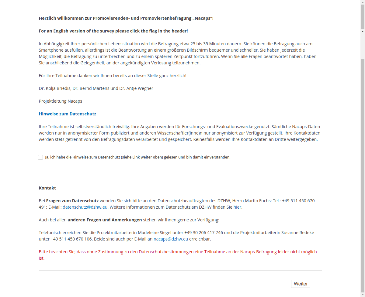 Bitte beachten Sie, dass ohne Zustimmung zu den Datenschutzbestimmungen eine Teilnahme an der Nacaps-Befragung leider nicht möglich ist.