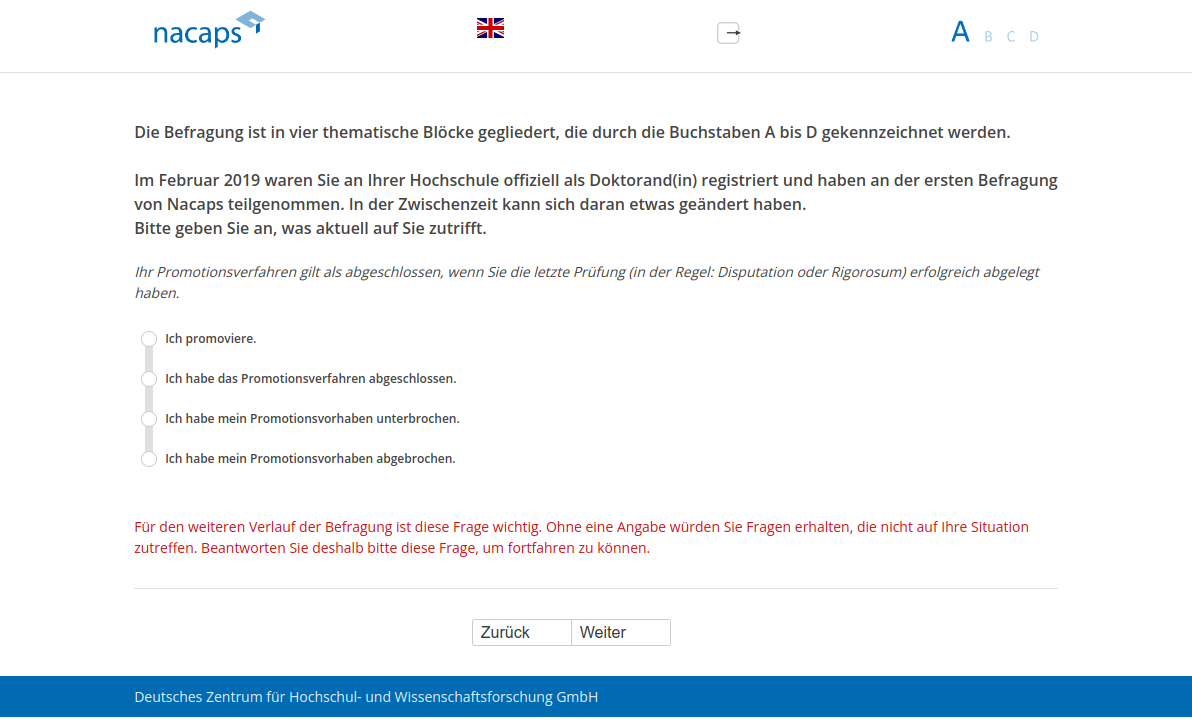 Die Befragung ist in vier thematische Blöcke gegliedert, die durch die Buchstaben A bis D gekennzeichnet werden. Im Februar 2019 waren Sie an Ihrer Hochschule offiziell als Doktorand(in) registriert und haben an der ersten Befragung von Nacaps teilgenommen. In der Zwischenzeit kann sich daran etwas geändert haben. Bitte geben Sie an, was aktuell auf Sie zutrifft.