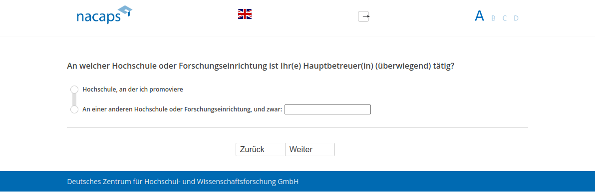 Bei der letzten Befragung, vor etwa einem Jahr, haben Sie folgende Angaben zur/zum Hauptbetreuer(in) Ihrer Promotion gemacht: Hat sich daran in der Zwischenzeit etwas geändert?,Bei der letzten Befragung, vor etwa einem Jahr, haben Sie (noch) keine Angaben zur/zum Hauptbetreuer(in) Ihrer Promotion gemacht. Deshalb stellen wir nun einige Fragen zu dieser Person.,Bei der letzten Befragung, vor etwa einem Jahr, haben Sie bereits einige Angaben zur/zum Hauptbetreuer(in) Ihrer Promotion gemacht. Da sich innerhalb eines Jahres einiges ändern kann, haben wir erneut einige Nachfragen zu dieser Person.