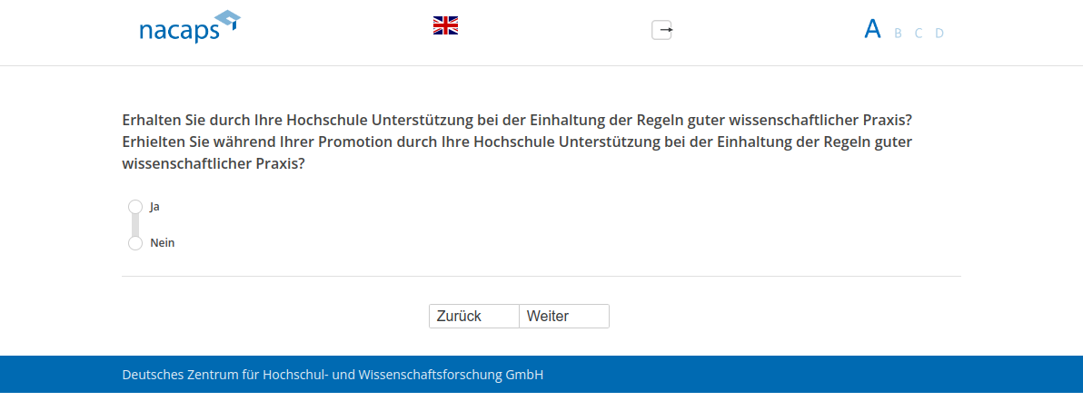 Erhalten Sie durch Ihre Hochschule Unterstützung bei der Einhaltung der Regeln guter wissenschaftlicher Praxis?,Erhielten Sie während Ihrer Promotion durch Ihre Hochschule Unterstützung bei der Einhaltung der Regeln guter wissenschaftlicher Praxis?