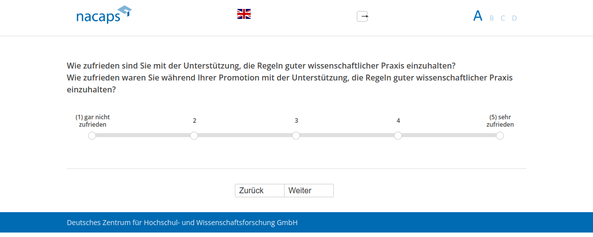Wie zufrieden sind Sie mit der Unterstützung, die Regeln guter wissenschaftlicher Praxis einzuhalten?,Wie zufrieden waren Sie während Ihrer Promotion mit der Unterstützung, die Regeln guter wissenschaftlicher Praxis einzuhalten?