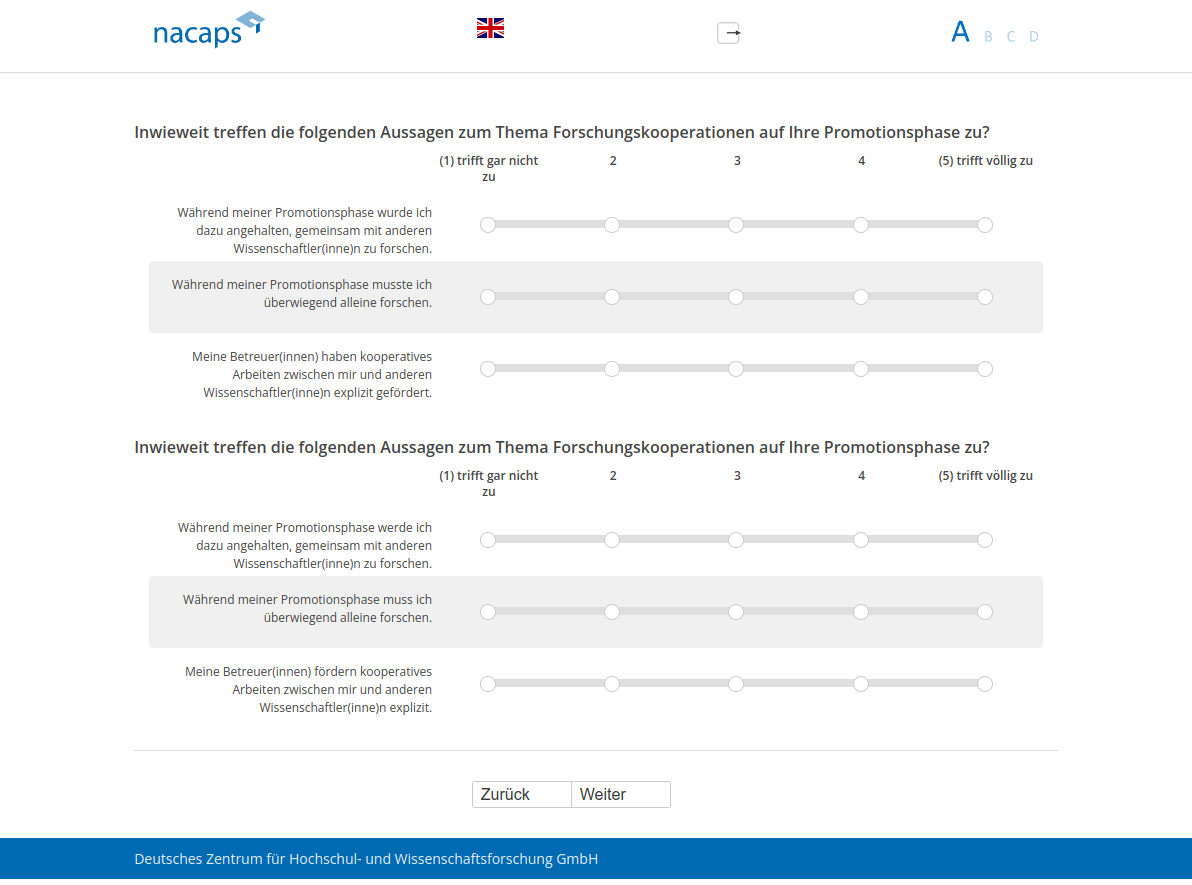 Im Folgenden geht es um die Frage, mit welchen Ansprüchen und Erwartungen Anderer Sie während der Promotionsphase konfrontiert sind.,Während meiner Promotionsphase...