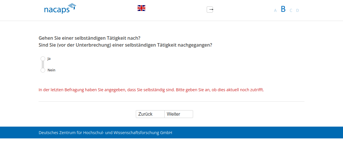 Gehen Sie einer selbständigen Tätigkeit nach?,Sind Sie (vor der Unterbrechung) einer selbständigen Tätigkeit nachgegangen?