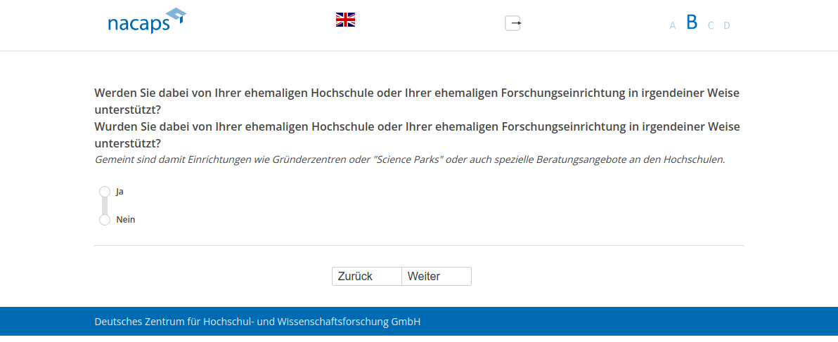 Werden Sie dabei von Ihrer ehemaligen Hochschule oder Ihrer ehemaligen Forschungseinrichtung in irgendeiner Weise unterstützt?,Wurden Sie dabei von Ihrer ehemaligen Hochschule oder Ihrer ehemaligen Forschungseinrichtung in irgendeiner Weise unterstützt?
