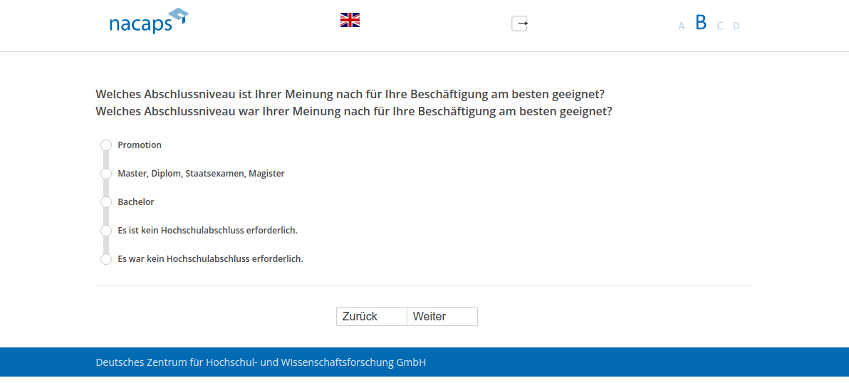 Welches Abschlussniveau ist Ihrer Meinung nach für Ihre Beschäftigung am besten geeignet?,Welches Abschlussniveau war Ihrer Meinung nach für Ihre Beschäftigung am besten geeignet?