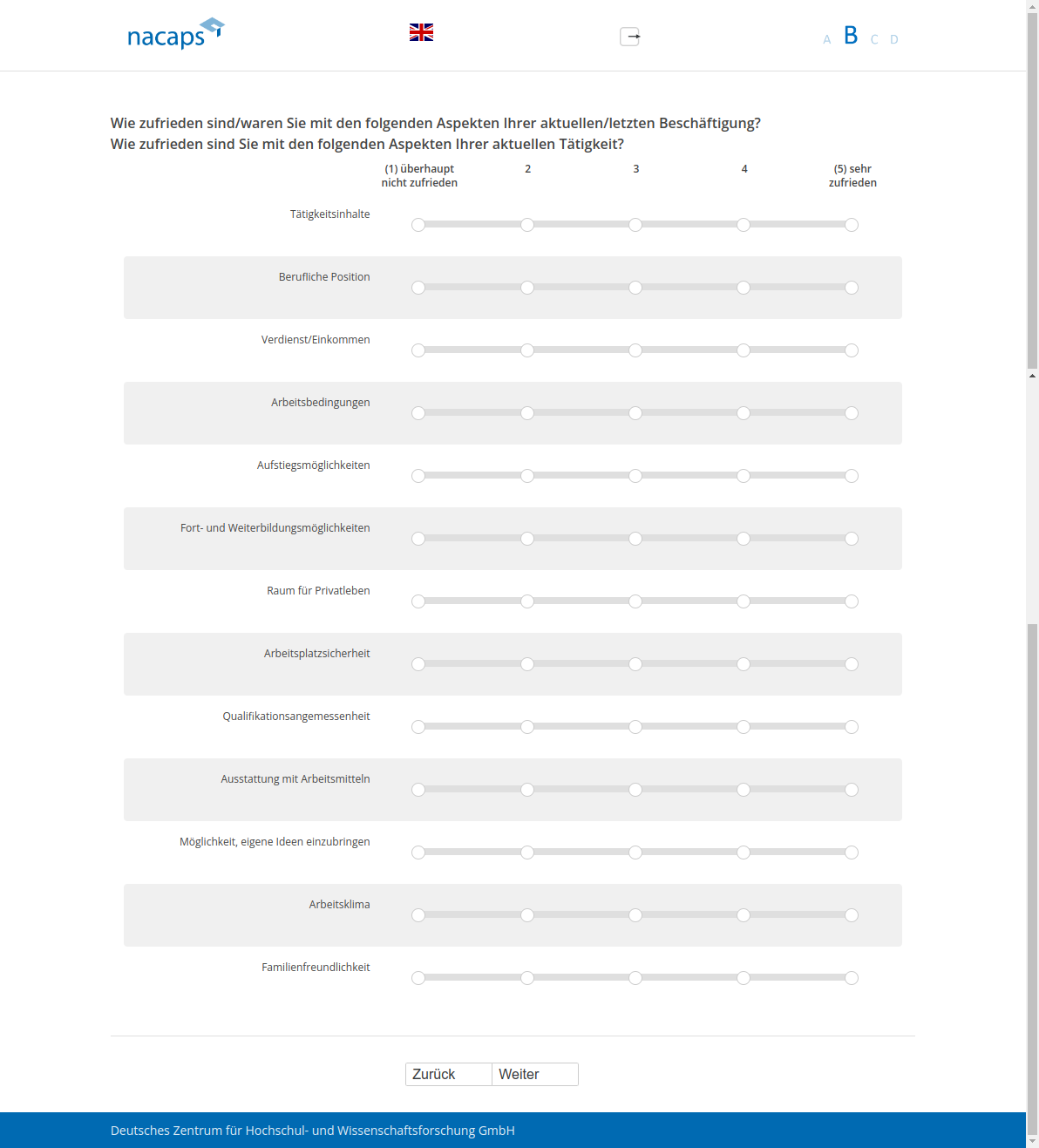 Wie zufrieden sind/waren Sie mit den folgenden Aspekten Ihrer aktuellen/letzten Beschäftigung?,Wie zufrieden sind Sie mit den folgenden Aspekten Ihrer aktuellen Tätigkeit?