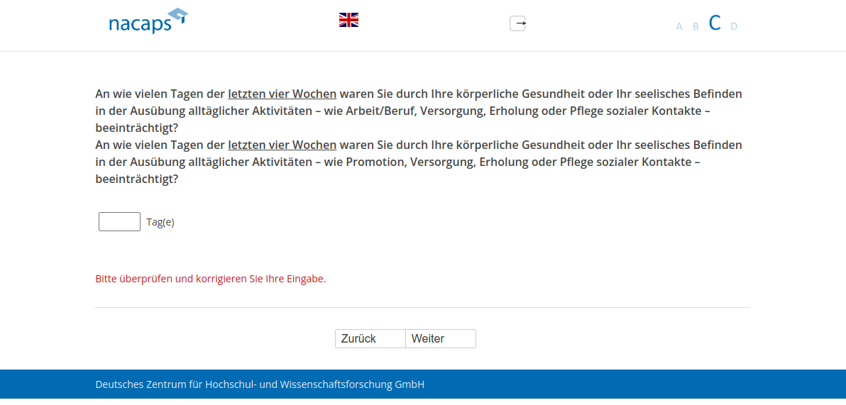 An wie vielen Tagen der letzten vier Wochen waren Sie durch Ihre körperliche Gesundheit oder Ihr seelisches Befinden in der Ausübung alltäglicher Aktivitäten – wie Arbeit/Beruf, Versorgung, Erholung oder Pflege sozialer Kontakte – beeinträchtigt?,An wie vielen Tagen der letzten vier Wochen waren Sie durch Ihre körperliche Gesundheit oder Ihr seelisches Befinden in der Ausübung alltäglicher Aktivitäten – wie Promotion, Versorgung, Erholung oder Pflege sozialer Kontakte – beeinträchtigt?