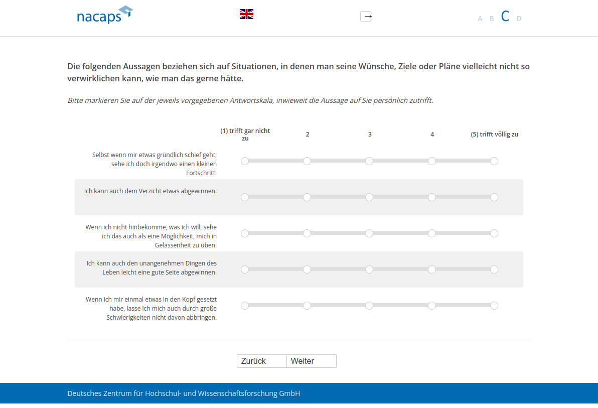 Die folgenden Aussagen beziehen sich auf Situationen, in denen man seine Wünsche, Ziele oder Pläne vielleicht nicht so verwirklichen kann, wie man das gerne hätte.