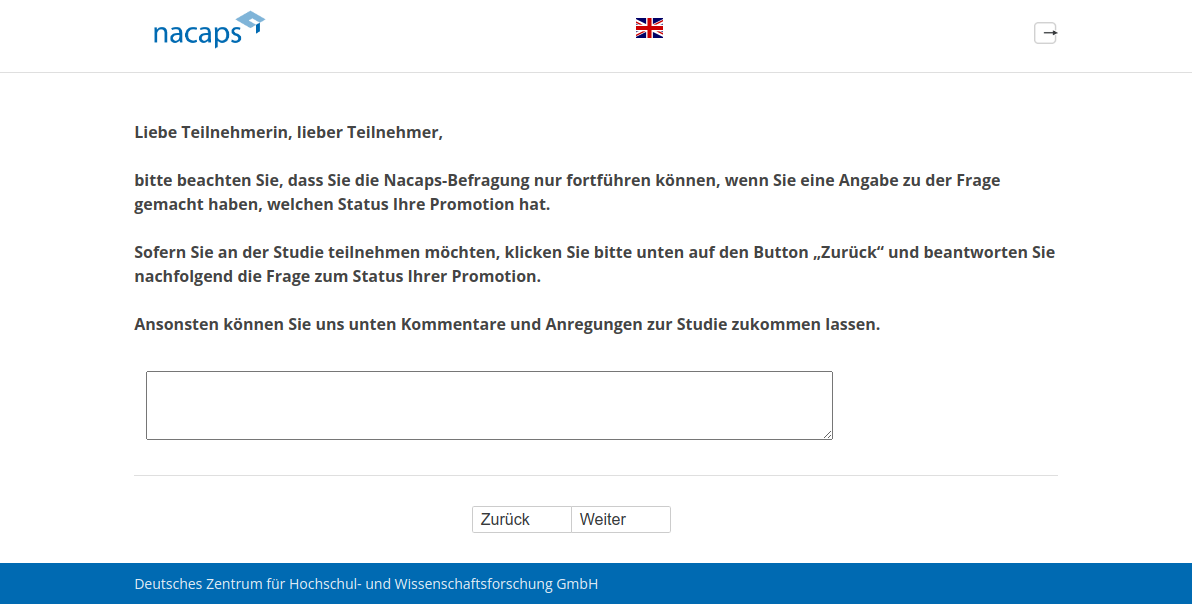 Liebe Teilnehmerin, lieber Teilnehmer, bitte beachten Sie, dass Sie die Nacaps-Befragung nur fortführen können, wenn Sie eine Angabe zu der Frage gemacht haben, welchen Status Ihre Promotion hat. Sofern Sie an der Studie teilnehmen möchten, klicken Sie bitte unten auf den Button „Zurück“ und beantworten Sie nachfolgend die Frage zum Status Ihrer Promotion. Ansonsten können Sie uns unten Kommentare und Anregungen zur Studie zukommen lassen.