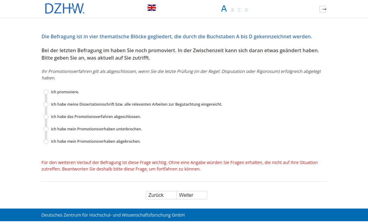 Liebe Teilnehmerin, lieber Teilnehmer, bitte beachten Sie, dass Sie die Nacaps-Befragung nur fortführen können, wenn Sie eine Angabe zu der Frage gemacht haben, welchen Status Ihre Promotion hat. Sofern Sie Interesse an der Teilnahme an der Studie haben, klicken Sie bitte unten auf den Button „Zurück“ und beantworten Sie nachfolgend die Frage zum Status Ihrer Promotion. Ansonsten können Sie uns unten Kommentare und Anregungen zur Studie zukommen lassen.