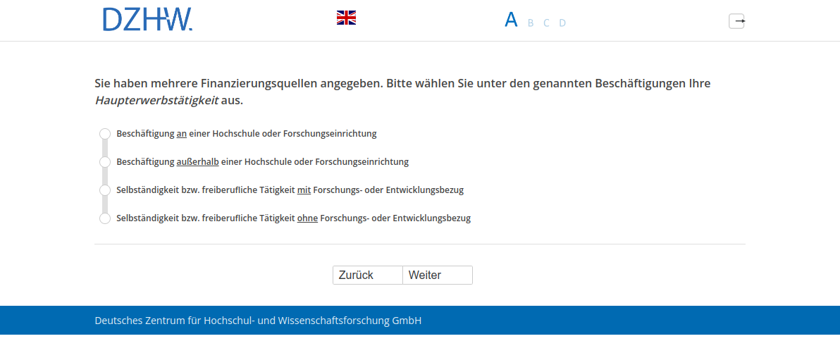 Sie haben mehrere Finanzierungsquellen angegeben. Bitte wählen Sie unter den genannten Beschäftigungen Ihre Haupterwerbstätigkeit aus.
