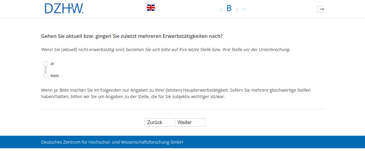 Wenn Sie (aktuell) nicht erwerbstätig sind, beziehen Sie sich bitte auf Ihre letzte Stelle bzw. Ihre Stelle vor der Unterbrechung.
