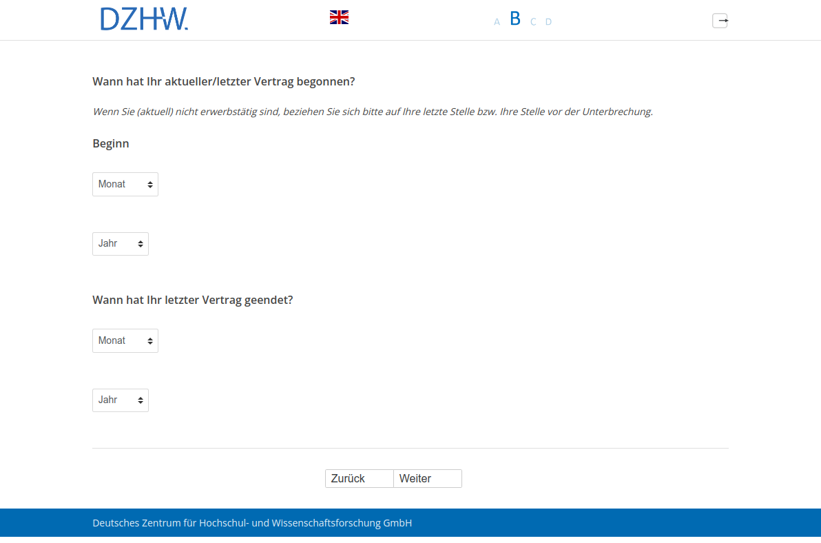 Wenn Sie (aktuell) nicht erwerbstätig sind, beziehen Sie sich bitte auf Ihre letzte Stelle bzw. Ihre Stelle vor der Unterbrechung.