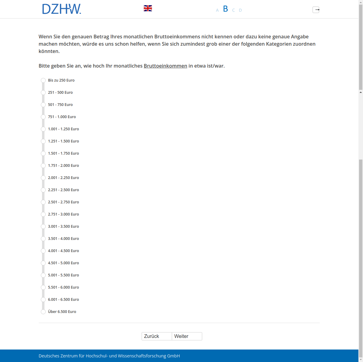 Wenn Sie den genauen Betrag Ihres monatlichen Bruttoeinkommens nicht kennen oder dazu keine genaue Angabe machen möchten, würde es uns schon helfen, wenn Sie sich zumindest grob einer der folgenden Kategorien zuordnen könnten. Bitte geben Sie an, wie hoch Ihr monatliches Bruttoeinkommen in etwa ist/war.