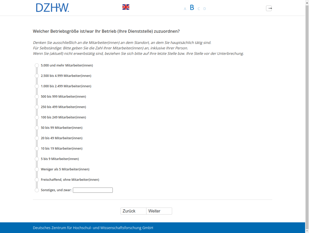 Denken Sie ausschließlich an die Mitarbeiter(innen) an dem Standort, an dem Sie hauptsächlich tätig sind. Für Selbständige: Bitte geben Sie die Zahl Ihrer Mitarbeiter(innen) an, inklusive Ihrer Person. Wenn Sie (aktuell) nicht erwerbstätig sind, beziehen Sie sich bitte auf Ihre letzte Stelle bzw. Ihre Stelle vor der Unterbrechung.