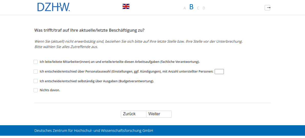 Wenn Sie (aktuell) nicht erwerbstätig sind, beziehen Sie sich bitte auf Ihre letzte Stelle bzw. Ihre Stelle vor der Unterbrechung. Bitte wählen Sie alles Zutreffende aus.