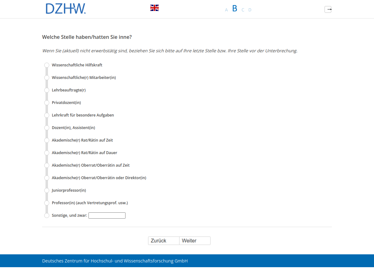 Wenn Sie (aktuell) nicht erwerbstätig sind, beziehen Sie sich bitte auf Ihre letzte Stelle bzw. Ihre Stelle vor der Unterbrechung.