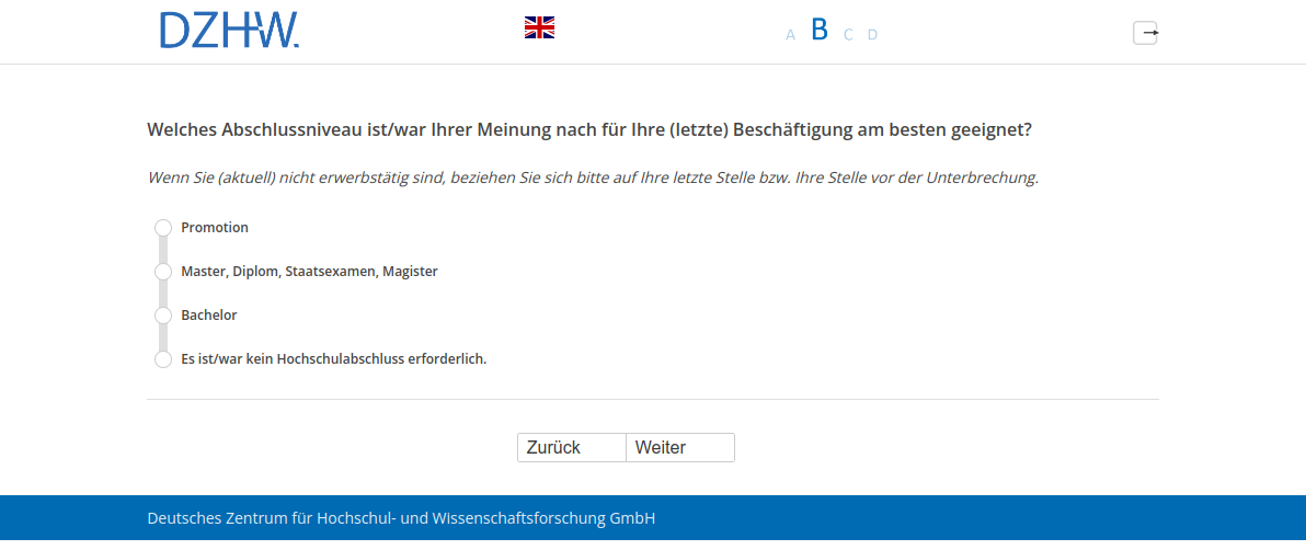 Wenn Sie (aktuell) nicht erwerbstätig sind, beziehen Sie sich bitte auf Ihre letzte Stelle bzw. Ihre Stelle vor der Unterbrechung.