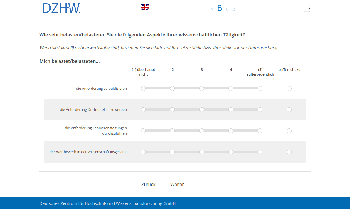 Wie sehr belasten/belasteten Sie die folgenden Aspekte Ihrer wissenschaftlichen Tätigkeit?,Mich belastet/belasteten...