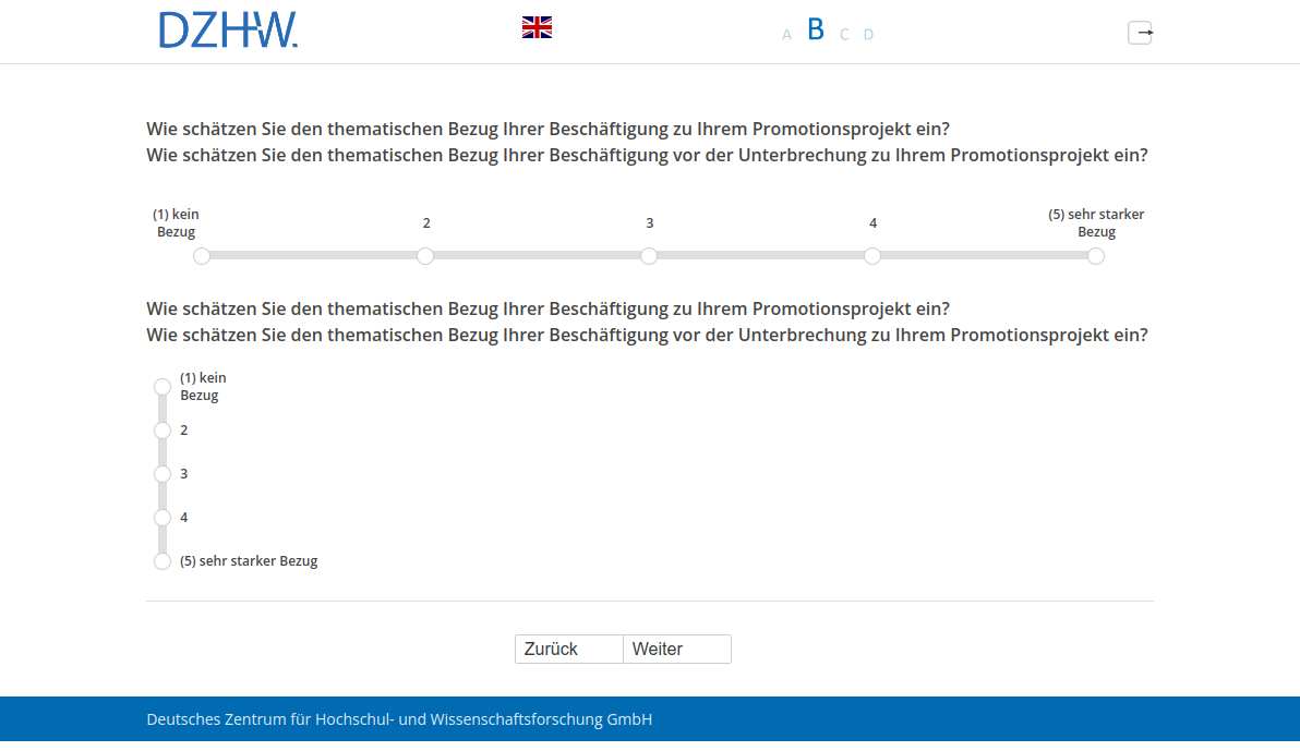Wie schätzen Sie den thematischen Bezug Ihrer Beschäftigung zu Ihrem Promotionsprojekt ein?,Wie schätzen Sie den thematischen Bezug Ihrer Beschäftigung vor der Unterbrechung zu Ihrem Promotionsprojekt ein? Wie schätzen Sie den thematischen Bezug Ihrer Beschäftigung zu Ihrem Promotionsprojekt ein?,Wie schätzen Sie den thematischen Bezug Ihrer Beschäftigung vor der Unterbrechung zu Ihrem Promotionsprojekt ein?
