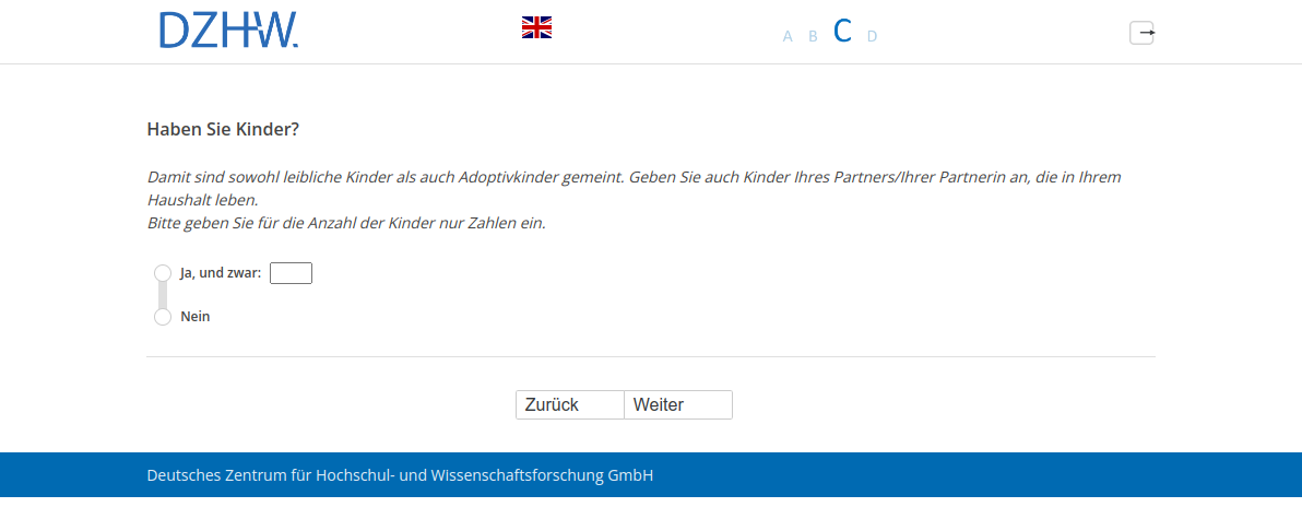 Damit sind sowohl leibliche Kinder als auch Adoptivkinder gemeint. Geben Sie auch Kinder Ihres Partners/Ihrer Partnerin an, die in Ihrem Haushalt leben. Bitte geben Sie für die Anzahl der Kinder nur Zahlen ein.