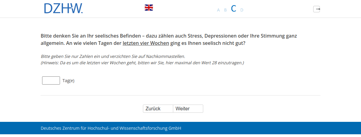 Bitte denken Sie an Ihr seelisches Befinden – dazu zählen auch Stress, Depressionen oder Ihre Stimmung ganz allgemein. An wie vielen Tagen der letzten vier Wochen ging es Ihnen seelisch nicht gut?