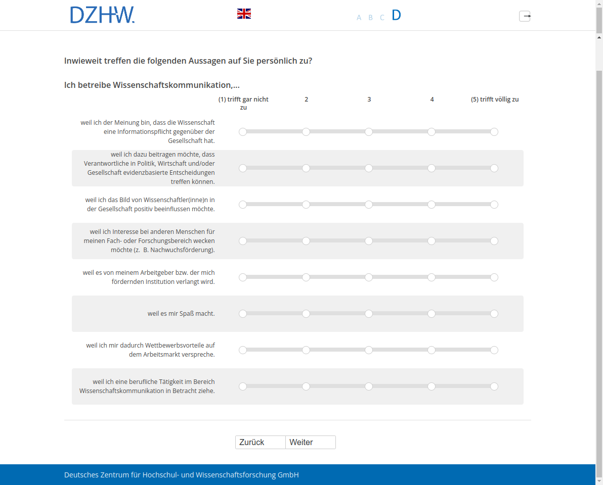 Inwieweit treffen die folgenden Aussagen auf Sie persönlich zu? Ich betreibe Wissenschaftskommunikation,...