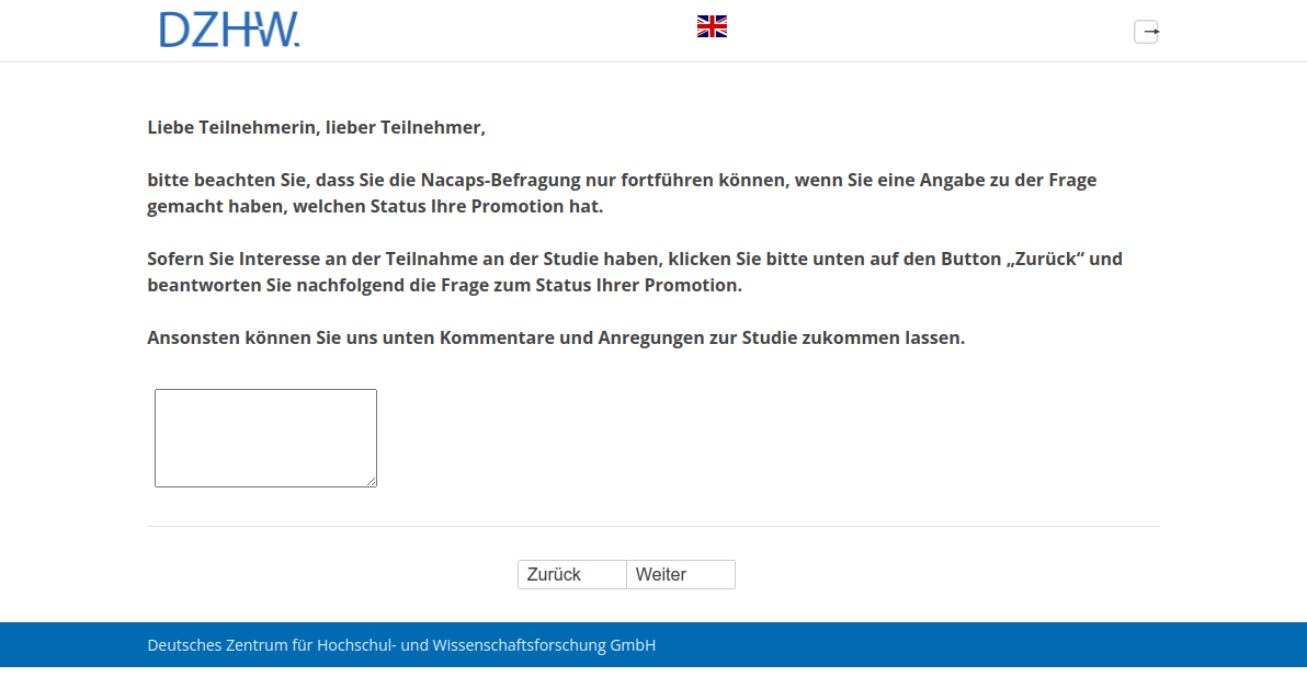 Liebe Teilnehmerin, lieber Teilnehmer, bitte beachten Sie, dass Sie die Nacaps-Befragung nur fortführen können, wenn Sie eine Angabe zu der Frage gemacht haben, welchen Status Ihre Promotion hat. Sofern Sie Interesse an der Teilnahme an der Studie haben, klicken Sie bitte unten auf den Button „Zurück“ und beantworten Sie nachfolgend die Frage zum Status Ihrer Promotion. Ansonsten können Sie uns unten Kommentare und Anregungen zur Studie zukommen lassen.