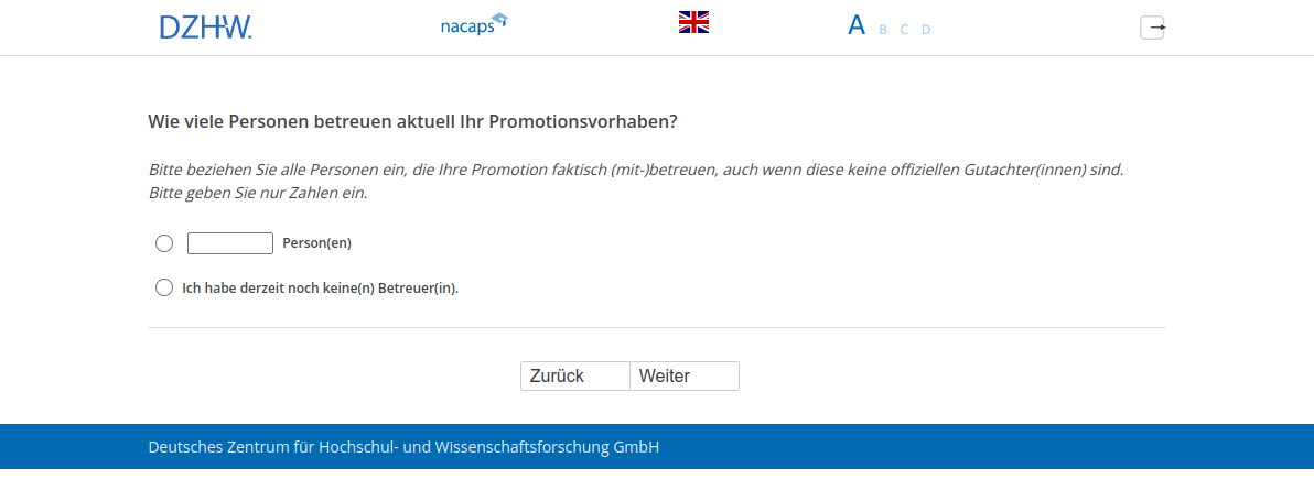 Bitte beziehen Sie alle Personen ein, die Ihre Promotion faktisch (mit-)betreuen, auch wenn diese keine offiziellen Gutachter(innen) sind.,Bitte geben Sie nur Zahlen ein.