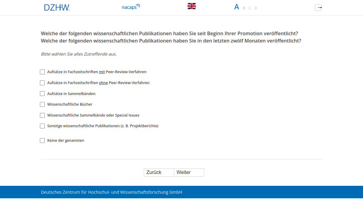 Welche der folgenden wissenschaftlichen Publikationen haben Sie seit Beginn Ihrer Promotion veröffentlicht?,Welche der folgenden wissenschaftlichen Publikationen haben Sie in den letzten zwölf Monaten veröffentlicht?