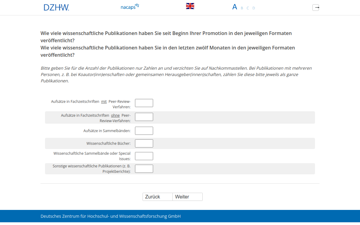 Wie viele wissenschaftliche Publikationen haben Sie seit Beginn Ihrer Promotion in den jeweiligen Formaten veröffentlicht?,Wie viele wissenschaftliche Publikationen haben Sie in den letzten zwölf Monaten in den jeweiligen Formaten veröffentlicht?