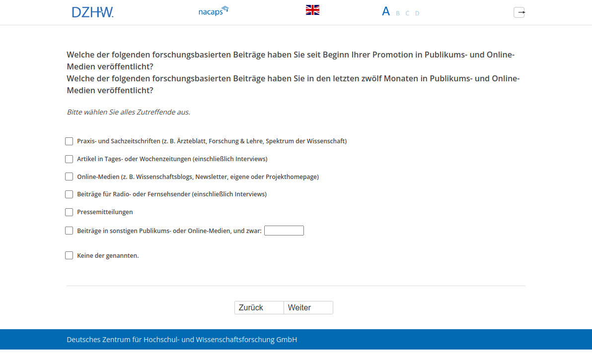 Wie viele forschungsbasierte Beiträge haben Sie seit Beginn Ihrer Promotion in den jeweiligen Publikums- und Online-Medien veröffentlicht?,Wie viele forschungsbasierte Beiträge haben Sie in den letzten zwölf Monaten in den jeweiligen Publikums- und Online-Medien veröffentlicht?