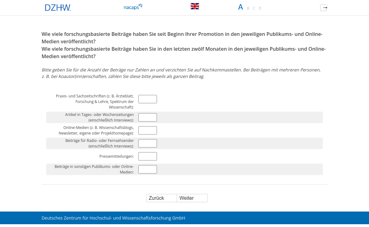 Wie viele forschungsbasierte Beiträge haben Sie seit Beginn Ihrer Promotion in den jeweiligen Publikums- und Online-Medien veröffentlicht?,Wie viele forschungsbasierte Beiträge haben Sie in den letzten zwölf Monaten in den jeweiligen Publikums- und Online-Medien veröffentlicht?