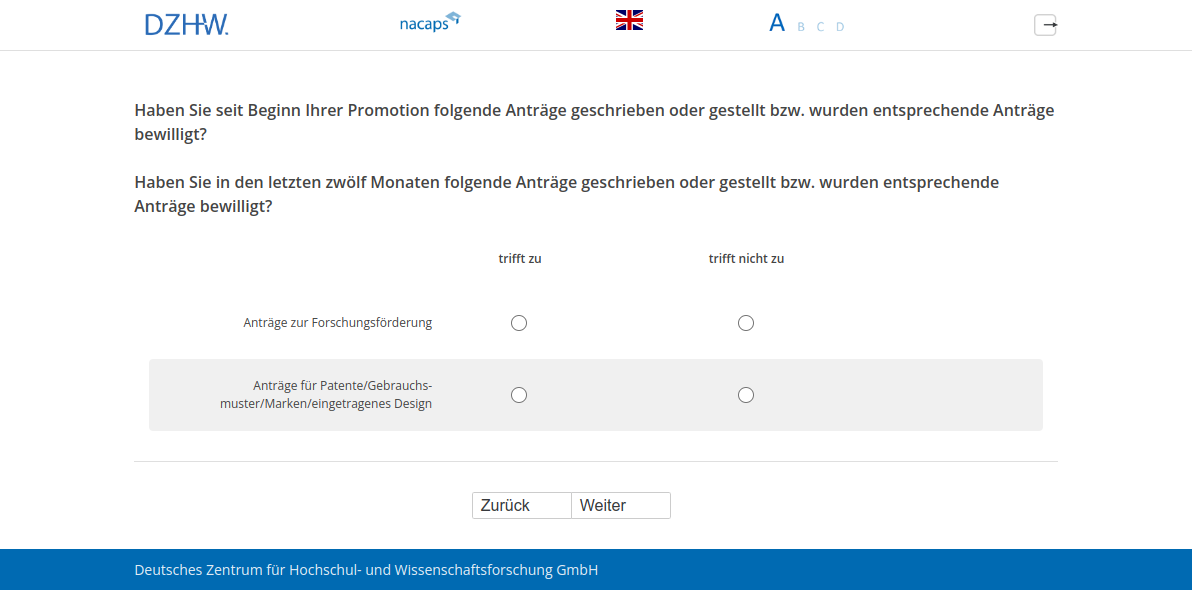 Wie viele Anträge auf Forschungsförderung, an denen Sie mitgearbeitet haben, wurden seit Beginn Ihrer Promotion bewilligt?,Wie viele Anträge auf Forschungsförderung, an denen Sie mitgearbeitet haben, wurden in den letzten zwölf Monaten bewilligt?